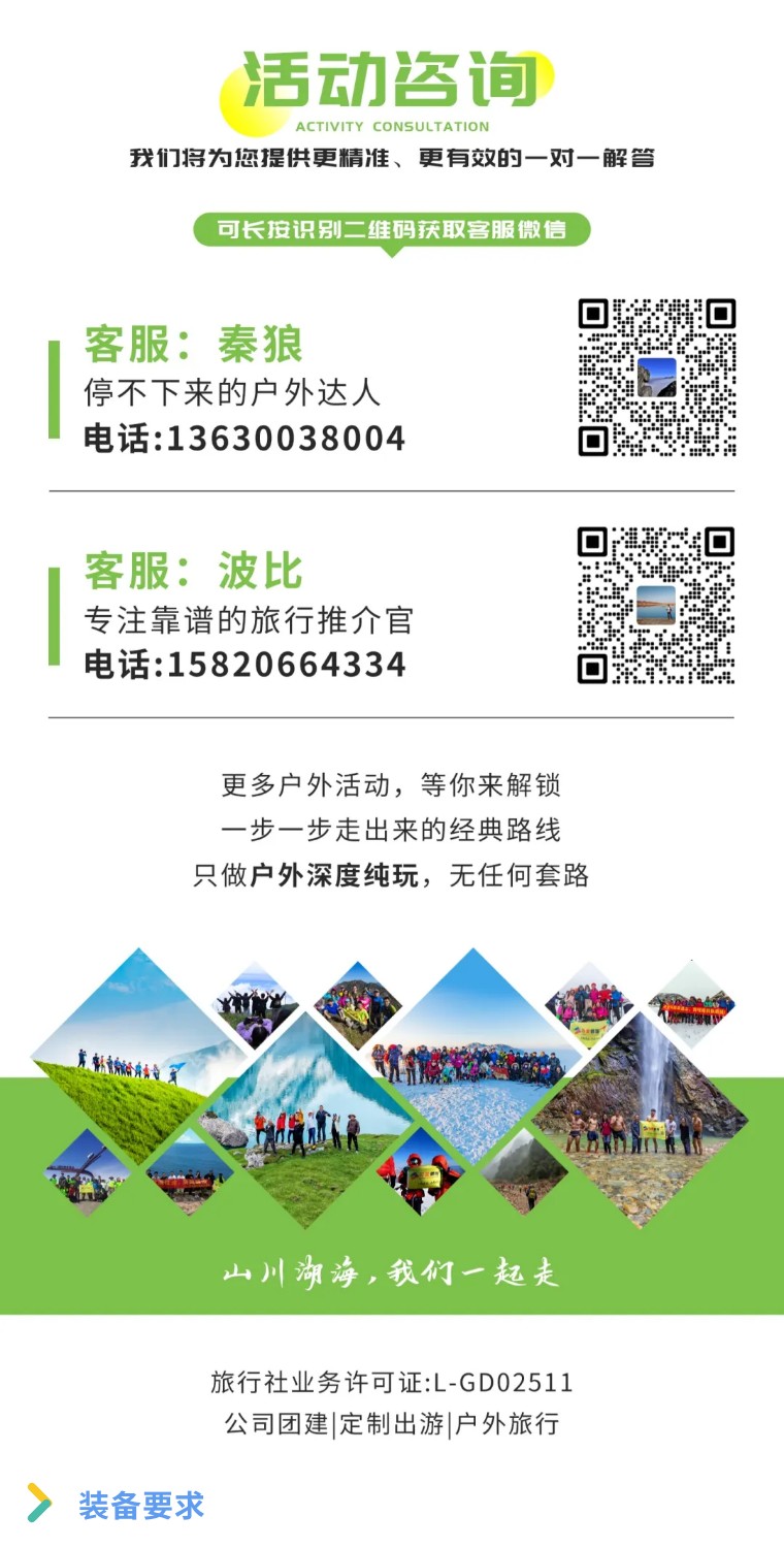 温馨提示:以上行程安排仅供参考,户外环境情况多变不稳定,因突发因素(包括但不限于因队员体力不支,抽筋,扭到脚,受伤,堵车等情况)和不可抗力因素导致不能按原定路线进行或者耽误回程时间的,领队有权根据实际情况调整,而且不接受因此投诉和退款的要求,报名即为接受安排。