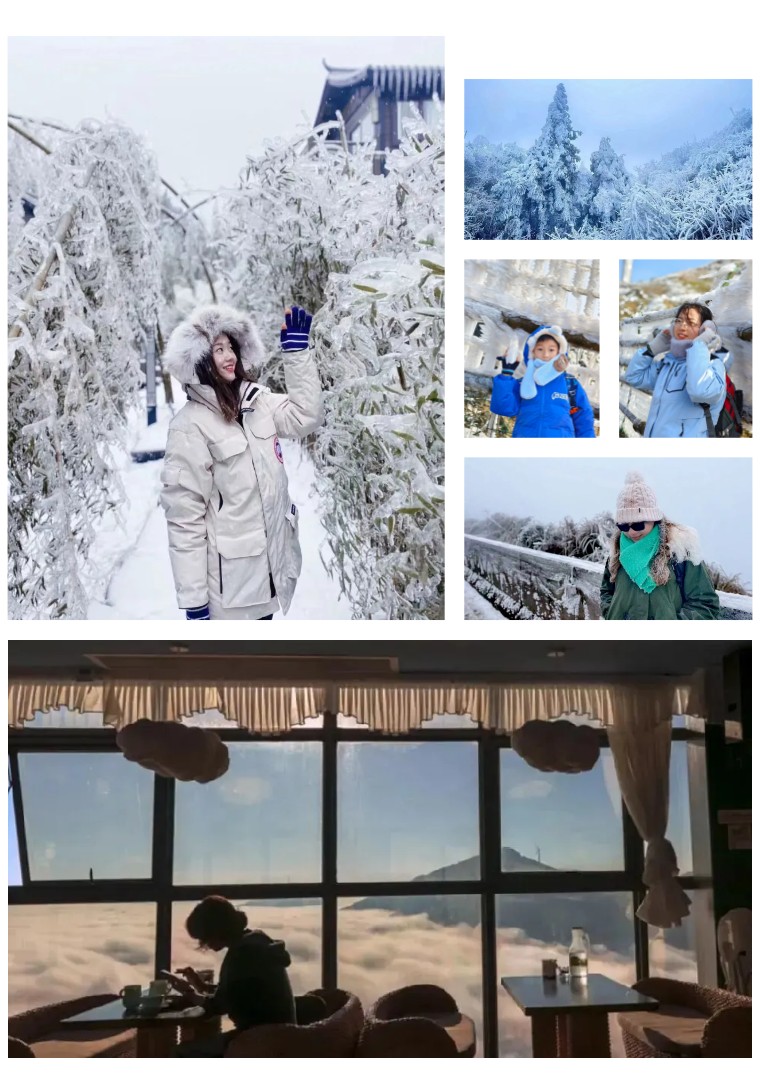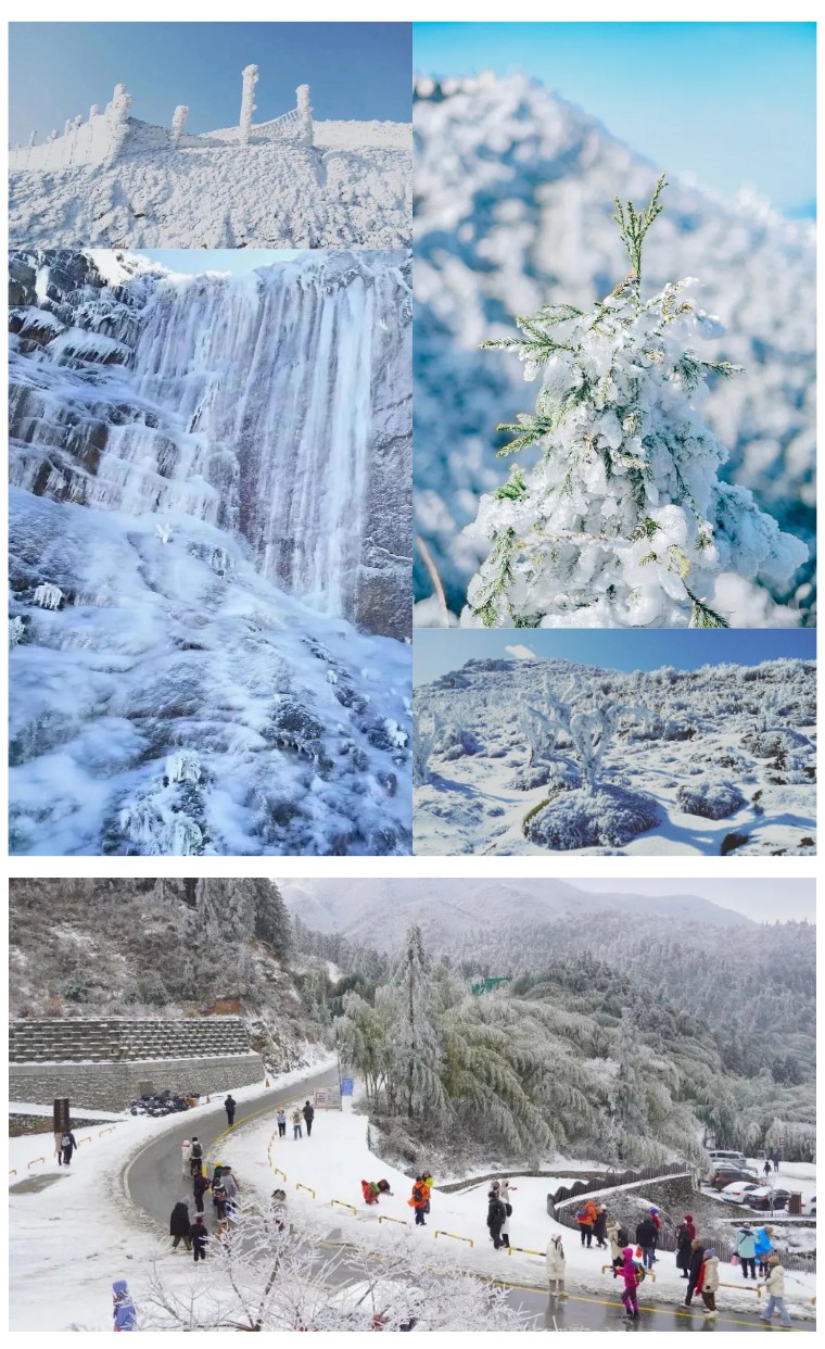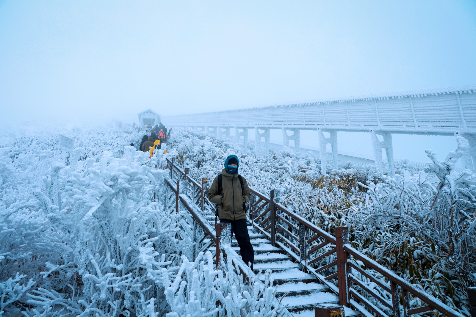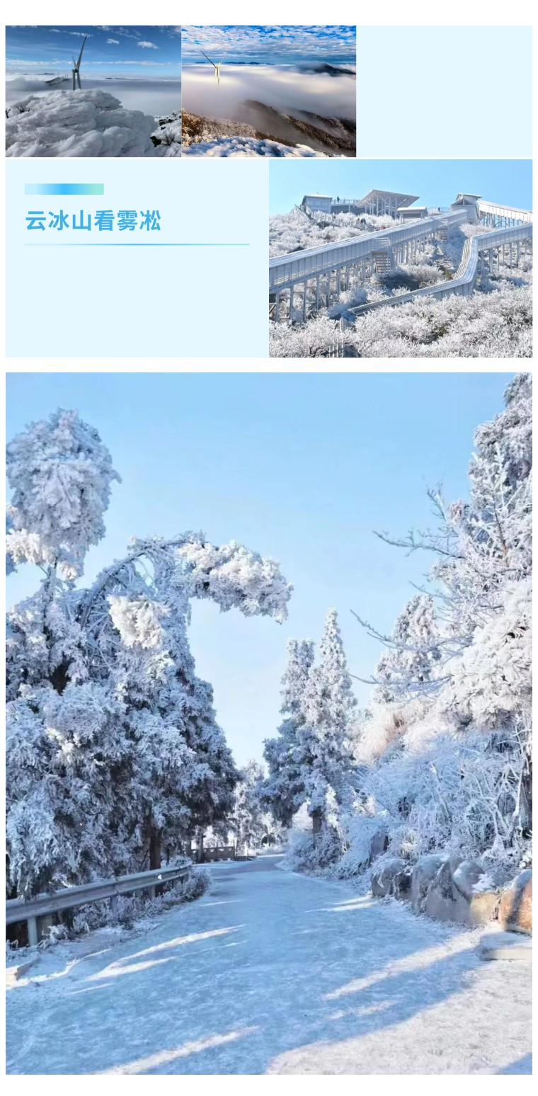 最佳观赏期:云冰山冰雪期仅限寒潮来袭,12月至次年2月最常见。当冷空气南下时,冷暖气流在山顶交汇碰撞,当地气温降至0-5°C左右,就有可能出现雾凇冰挂景观。雪后初晴的天气最出片!