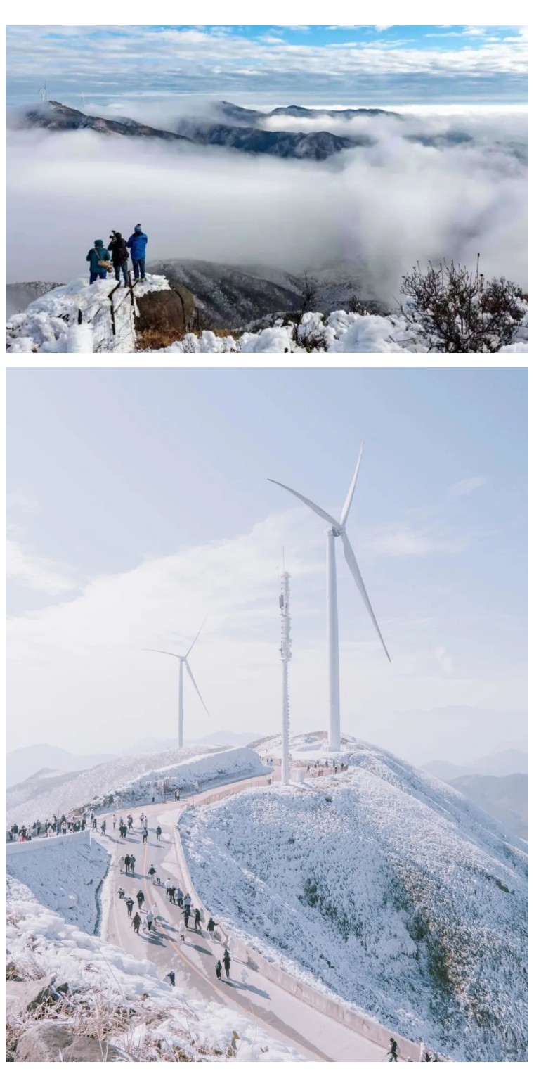 520级木栈道拾级而上,寓意"一路走到白头",牵手登顶便可以同时踏在湖南和广东的土地上。冰雪中的风车转动,随手拍都是冬日电影帧。