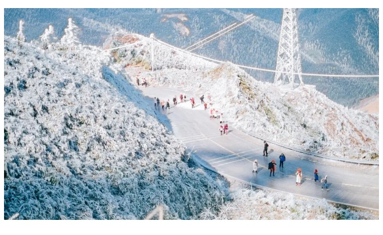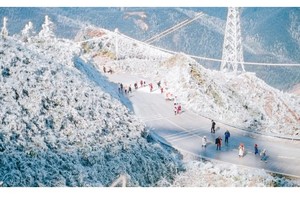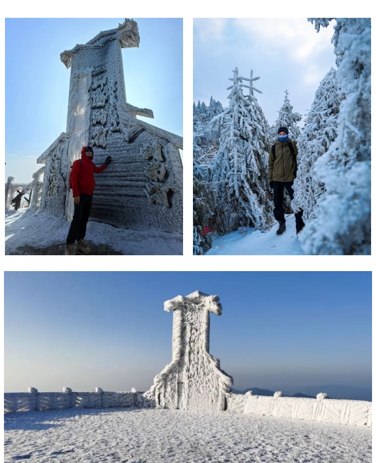 12:00 左右到达云冰山。开始从竹林雾凇观赏,领队带着大家前往山顶,都是水泥路难度不大哦(路边结冰需要配冰爪,山脚有卖)漫步在大风车下看漫山遍野的冰封世界,四周的苔藓,植被的冰挂。(体验捏雪球和掰冰棒的快乐)走过冰封铁索桥,最后登顶“一脚跨两省”标志观景台,一路雪景奇观拍照不停。(可以坐车上山腰,如遇道路结冰等恶劣天气,景区中转车暂停运营且费用没的退,徒步上顶约3公里40分钟左右);