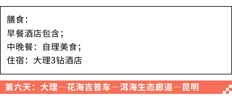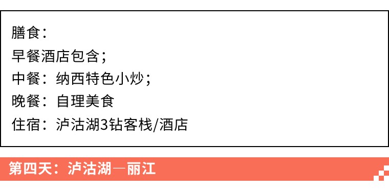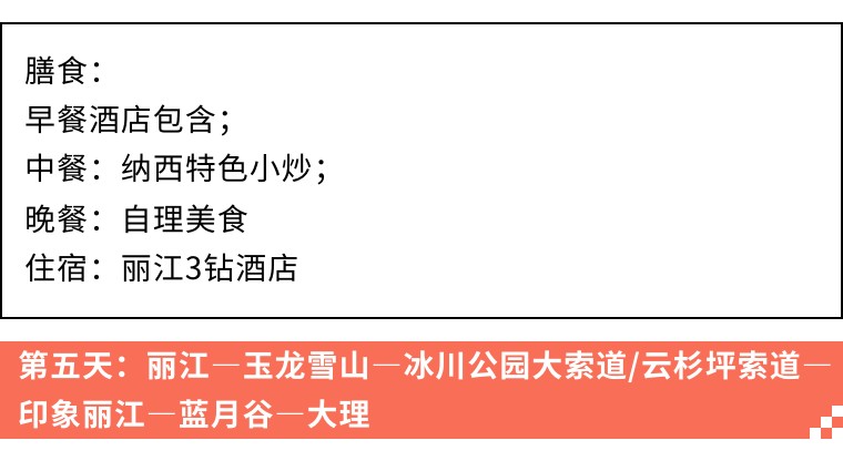 3、门票:丽江玉龙雪山景区门票,玉龙雪山冰川公园大索道,景区内观光大巴车车费,印象丽江费用;南诏风情岛摆渡车费用,大理花海吉普车旅拍费用,泸沽湖门票,泸沽湖划船,泸沽湖篝火晚会费用;