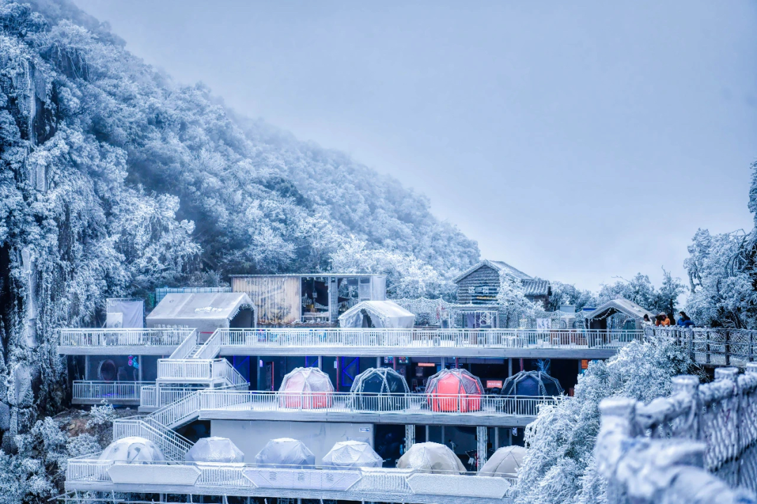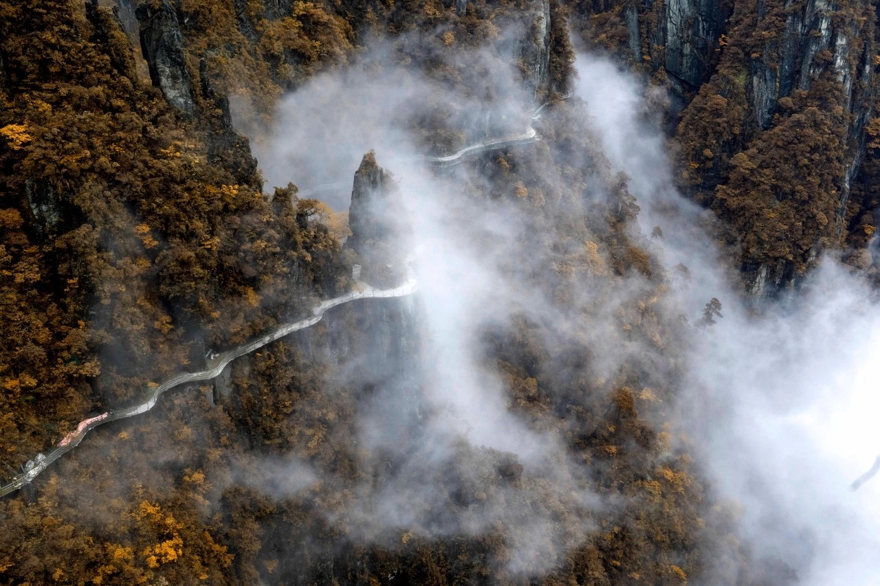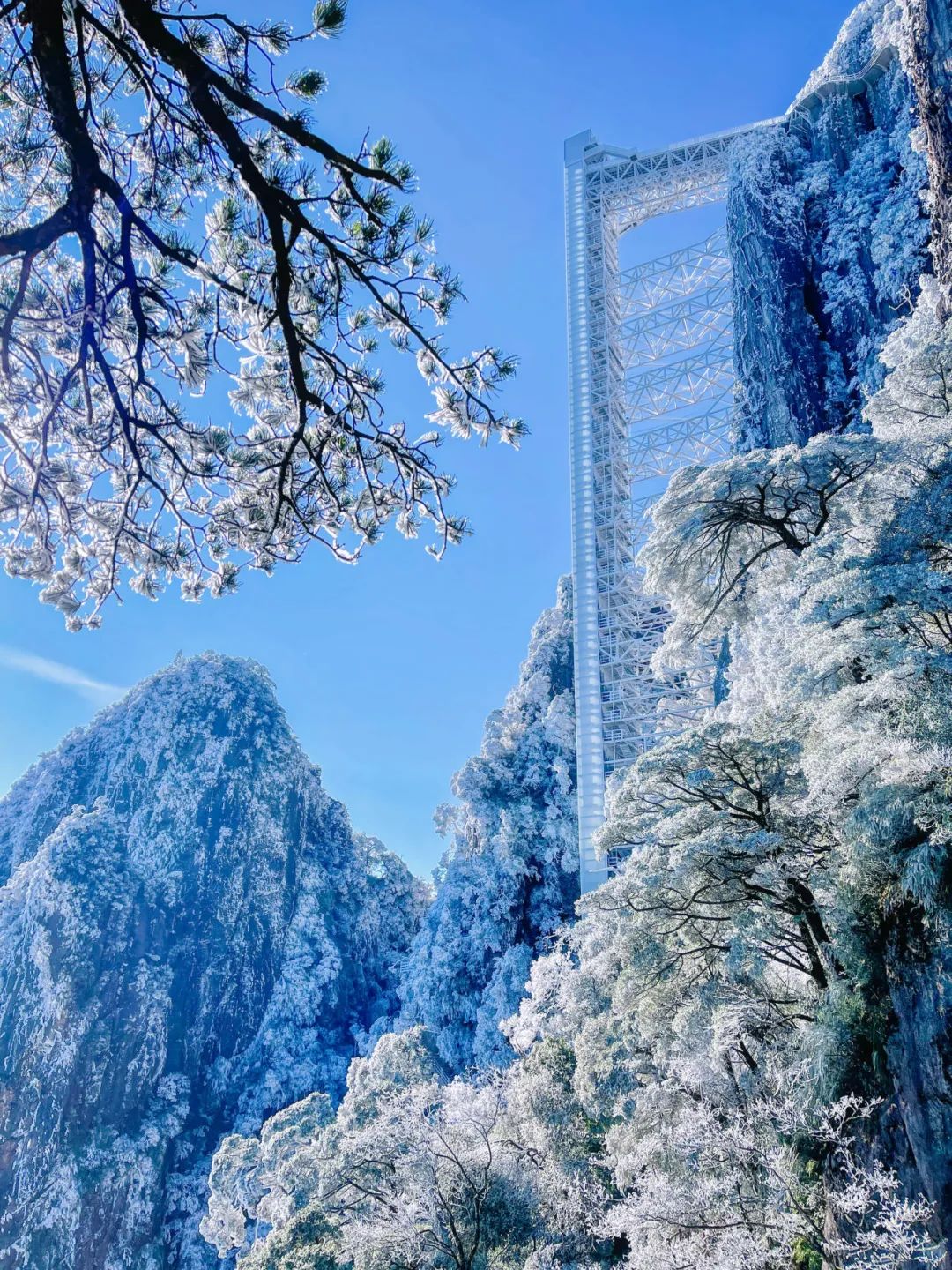 13:00 体验垂直观光电梯(电梯不含在大门票里面,建议乘坐,自理费用:单程40元/人),沿着悬空栈道一路经过金鞭大峡谷-东天门-七星崖-大天台,大天台号称“中南第一险”,运气好可以看到壮观的云海、雾凇奇观;