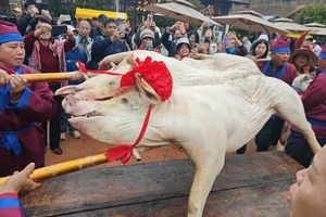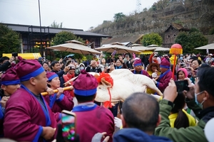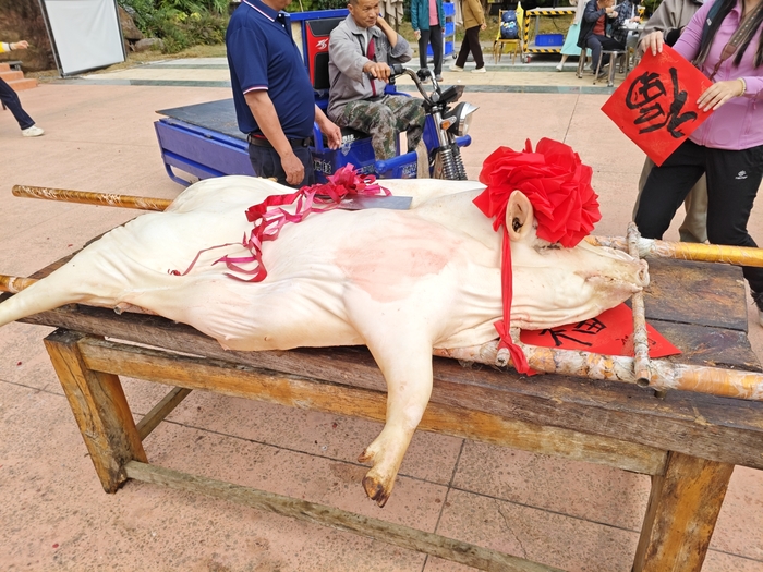 ① 基地会把一头剃完毛的大福猪绑在架子与戴好大红花,游客们可参与抬福猪绕广场走动的环节,寓意着团圆、幸福与美满;摸摸猪头,事业学业更上一层楼,摸摸猪身,事业财运都就手。