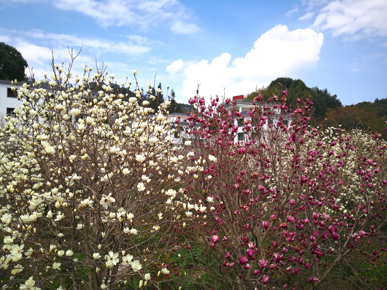 村里的步道小径两侧种满了白玉兰、紫玉兰
